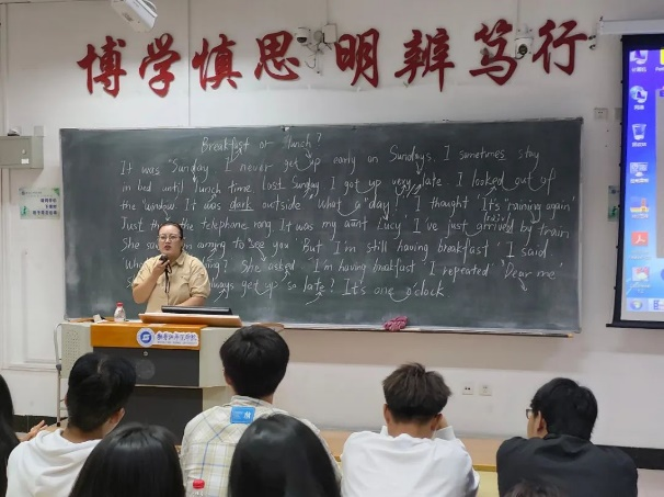 宋洪雷老师首先针对前几阶段的模仿学习进行检查,邀请员工们进行新概念课文模仿,讲述了发音与朗读的整合以及语音练习中语意和语调的重要性。宋老师用现场听音频跟读的方式逐词逐句地纠正员工们的发音、连读、重读以及弱读等发音知识与技巧,并要求英语语音的练习要确保单音准确,把握好轻重音和节奏,掌握多种语调一个升调的语句,强调英语语音语调并不是只在末尾的单词上升一下,而是语调逐步抬升的过程不同于单词的重读音节通常有固定的位置,语句的语调常常因情境、说话人的意图、态度等而变化。最后,宋老师建议同学们进行大量临摹,持续练习,英语语音的学习非一日之成,一定要注意日积月累。