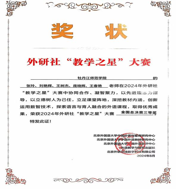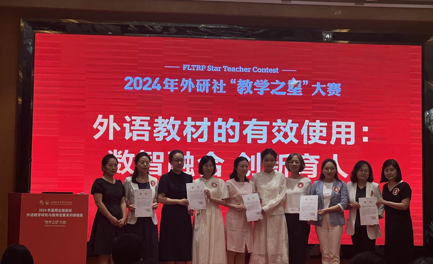 据悉,2024年外研社“教学之星”大赛以“外语教材的有效使用:数智融合,创新育人”为主题,引领教师落实立德树人根本任务,探索数字赋能教学创新,切实提升教学育人效果。接到赛讯后,由3044am永利教师张玲、刘艳辉、王树杰、庞晓辉、王春艳组成的“理解当代中国”教学团队,结合大赛主题,精心选择了参赛单元,并认真完成了教学设计方案和教学展示视频的录制。团队提交的参赛材料最终在全国“理解当代中国”组149个参赛团队中脱颖而出,获得了全国复赛特等奖以及全国半决赛的比赛资格。获得全国半决赛比赛资格后,团队教师积极备赛,认真钻研,精心打磨并完善课程。教学团队于2024年8月1日赶赴合肥,与来自全国包括华中农业大学、广东外语外贸大学等高校23个优秀的教学团队同台竞赛,最终取得了全国半决赛二等奖,全国总决赛三等奖的好成绩。