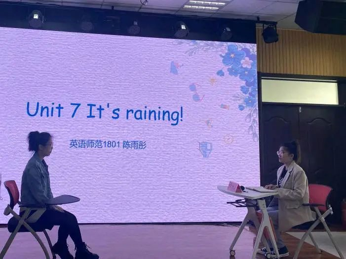 2018级英语师范一班和2018级英语师范二班两组选手选择教师招聘面试进行模拟。首先面试官对面试者进行基本工作问题理念的提问,随后每名面试者进行精彩纷呈、形象生动的英文试课演讲,最后面试者对试讲课程的想法和板书设计进行了简单介绍。两个小组同学的模拟面试过程完整且真实,试讲课堂互动密切,讲授的课程生动有趣,获得评委和同学们的一致喜爱。