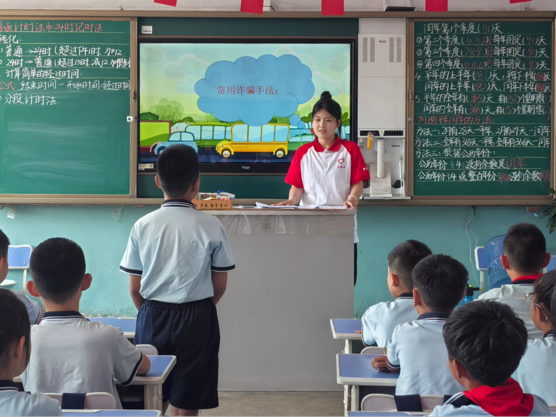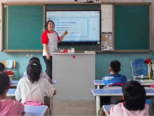 趣味英语课堂上,团队成员陈佳琪结合乡村孩子的特点,设计了生动有趣的教学环节,通过水果盲盒和水果转盘的形式,激发孩子们对英语的兴趣。孩子们踊跃参与互动,在轻松愉快的氛围中,勇敢开口说英语,让孩子们在欢快氛围中感受英语魅力,激发语言学习兴趣。