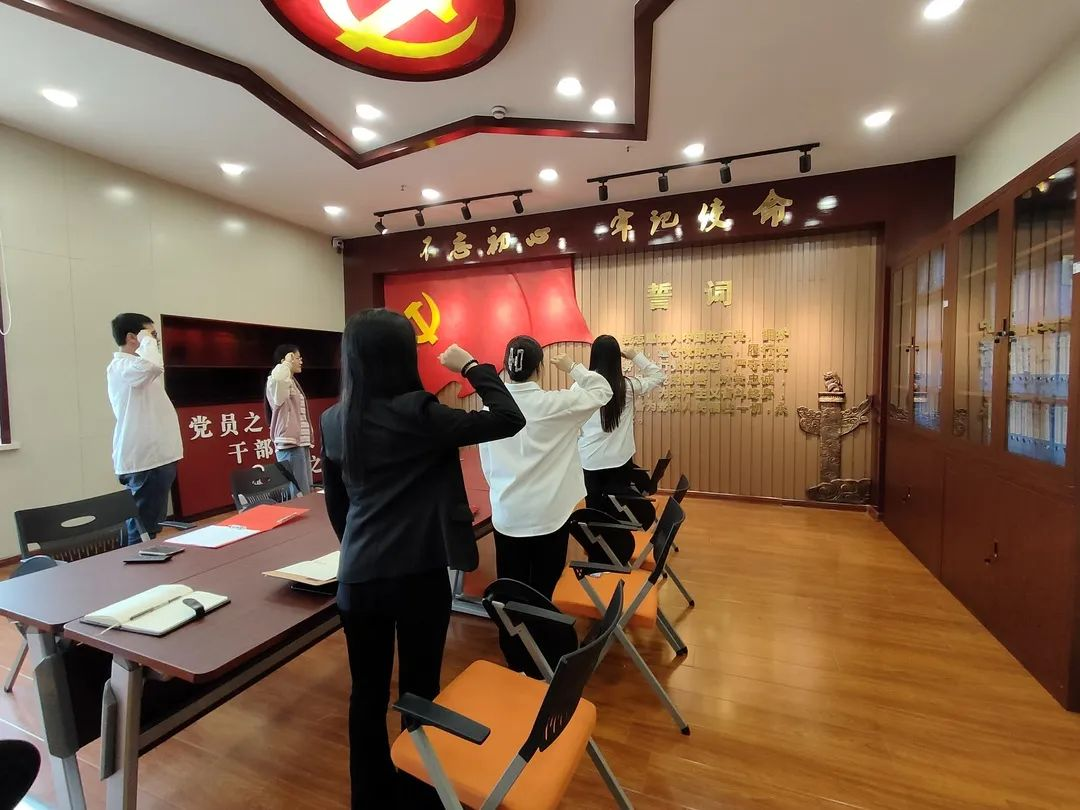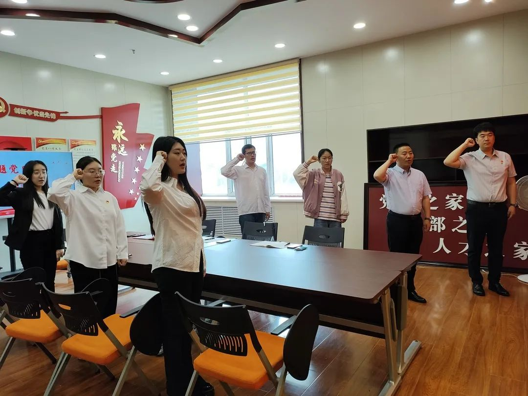 研究生党支部书记郭壮带领全体成员重温入党誓词。全体成员整齐肃立,举起右拳,以铿锵有力的誓言表达了对党的无限忠诚和跟党走的坚定决心。