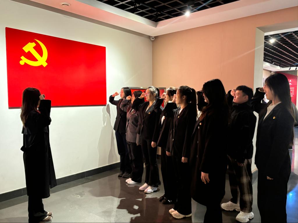 在参观结束后,全体党员同志在党支部书记王泽宇的带领下举起右拳,面向鲜红的党旗,在党的光辉下重温了入党誓词。这是心灵的触动,是信念的升华,是青年党员坚定理想信念,为共产主义事业奋斗终身决心的体现。