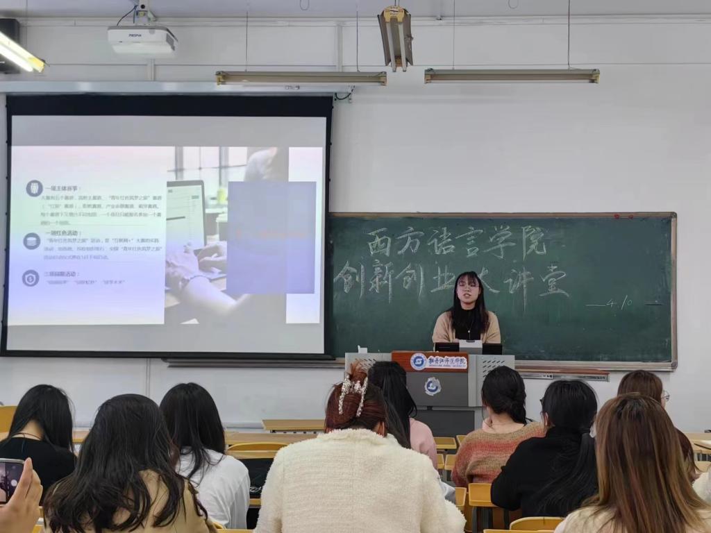 2022级英语语言文学班长刘亚戚分享创新创业大赛经历。在经验分享中她向大家介绍了互联网+大赛各个阶段的准备工作、如何立项、如何准备商业企划书,从多个角度细致入微地分享了大赛项目细节以及专业实用的参赛经验,将同学们眼中虚无缥缈的创新大赛形象变得清晰立体,为同学们提供了进一步的方向与指引。