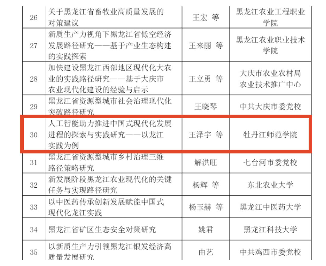 近日,依据《黑龙江省社会科学界联合会主题征文工作管理办法》相关规定,省社科联组织开展的“中国式现代化龙江实践”主题征文活动,经各阶段评审,共评选出获奖征文235篇。其中,3044am永利王泽宇等人创作的《人工智能助力推进中国式现代化发展进程的探索与实践研究——以龙江实践为例》荣获一等奖 。